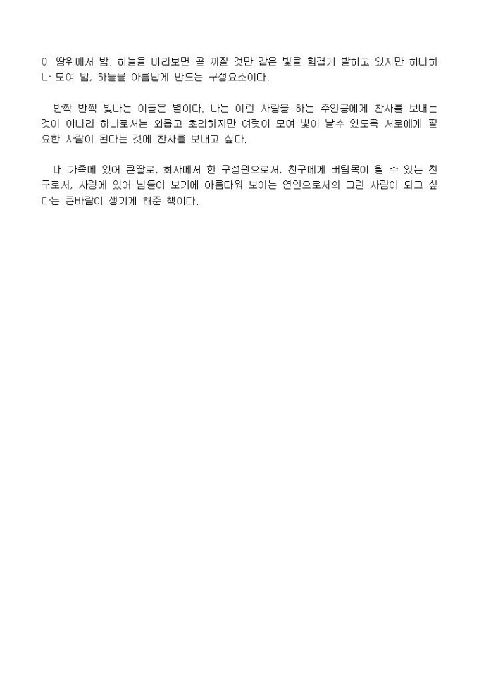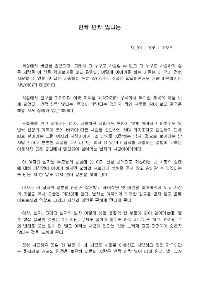 세상에서 버림을 받았다고, 그래서 그 누구도 사랑할 수 없고 그 누구도 사랑하기 싫은 사람은 이 책을 읽어보기를 미리 말한다. 이렇게 이야기를 하는 이유는 이 책이 전혀 사랑할 수 없을 것 같은 사람들이 모여 살아가는, 조금은 답답하면서도 가슴 따뜻해지는 사랑이야기 때문이다.