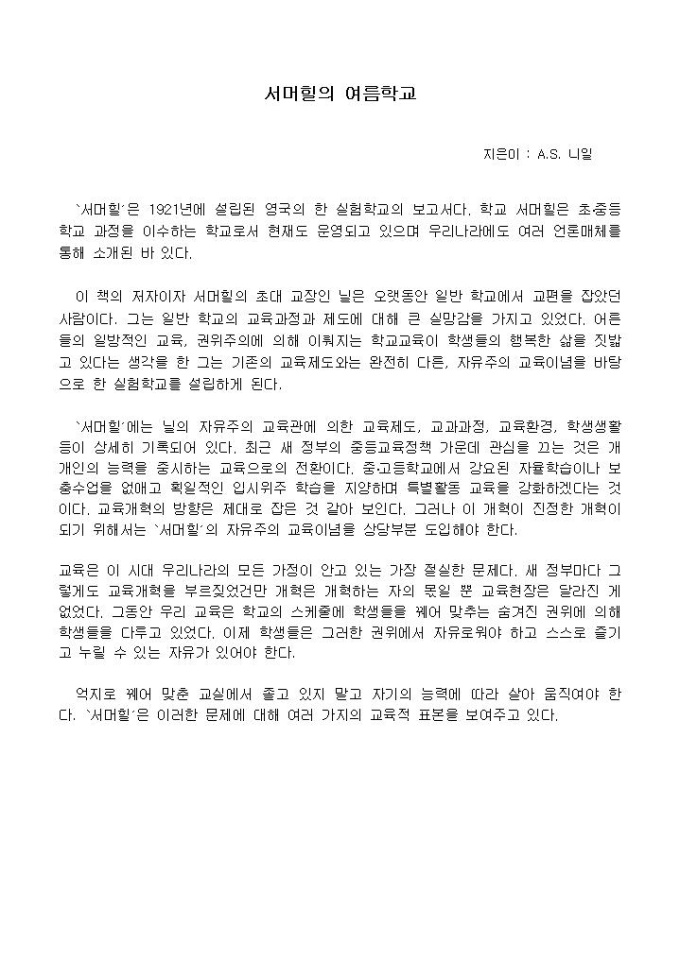 `서머힐′은 1921년에 설립된 영국의 한 실험학교의 보고서다. 학교 서머힐은 초·중등학교 과정을 이수하는 학교로서 현재도 운영되고 있으며 우리나라에도 여러 언론매체를 통해 소개된 바 있다.