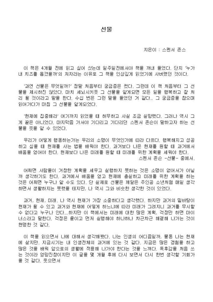 이 책은 4개월 전에 읽고 싶어 샀는데 일주일전에서야 책을 꺼내 들었다. 단지 ´누가 내 치즈를 옮겼을까´의 저자라는 이유로 그 책을 인상깊게 읽었기에 사버렸던 것이다.