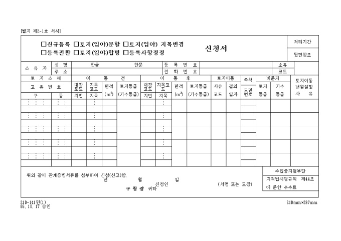 9,000원/월별지 제2-1호 서식으로 (신규등록,토지(임야)분항,등록전환,토지(임야)합병토지(임야)지목변경,등록사항정정)신청서입니다.