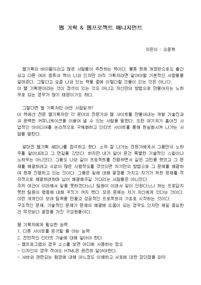웹기획의 바이블이라고 많은 사람들이 추천하는 책이다. 물론 현재 개정판으로도 출간되고 다른 여러 종류의 책이 나와 있지만 아직 기획자라면 알아야할 기본적인 사항들을 알려준다. 그렇다고 요즘 나와 있는 책들 중에 이렇다할 것들이 있는 것은 아니다.