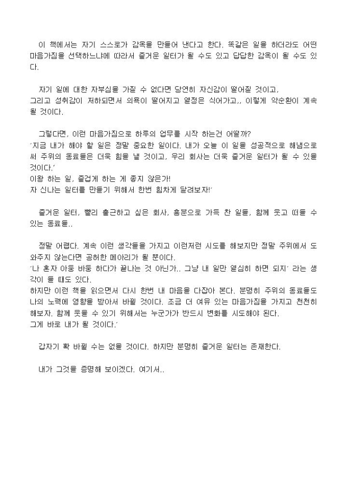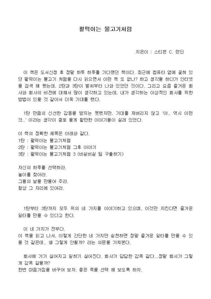 이 책은 도서신청 후 정말 하루 하루를 기다렸던 책이다. 최근에 컴퓨터 옆에 꽃혀 있던 펄떡이는 물고기 처럼을 다시 읽으면서 이런 책 또 없나? 하고 생각을 하다가 인터넷을 검색 해 봤는데, 2탄과 3탄이 벌써부터 나와 있었던 것이다. 그리고 요즘 즐거운 회사와 회사의 비전에 대해서 많이 생각하고 있는데, 내가 생각하는 이상적인 회사를 위한 방법이 있을 것 같아서 더욱 기대를 했다.