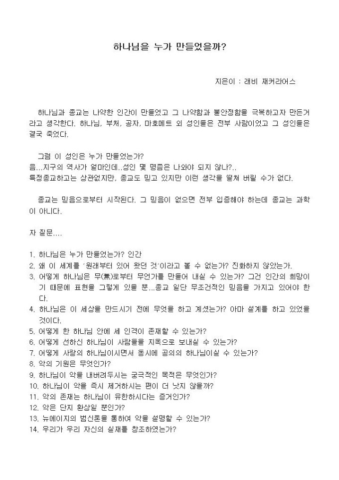 하나님과 종교는 나약한 인간이 만들었고 그 나약함과 불안정함을 극복하고자 만든거라고 생각한다. 하나님, 부처, 공자, 마호메트 외 성인들은 전부 사람이었고 그 성인들은 결국 죽었다.