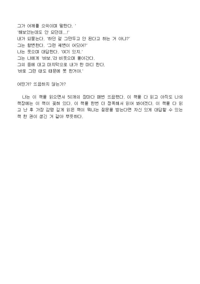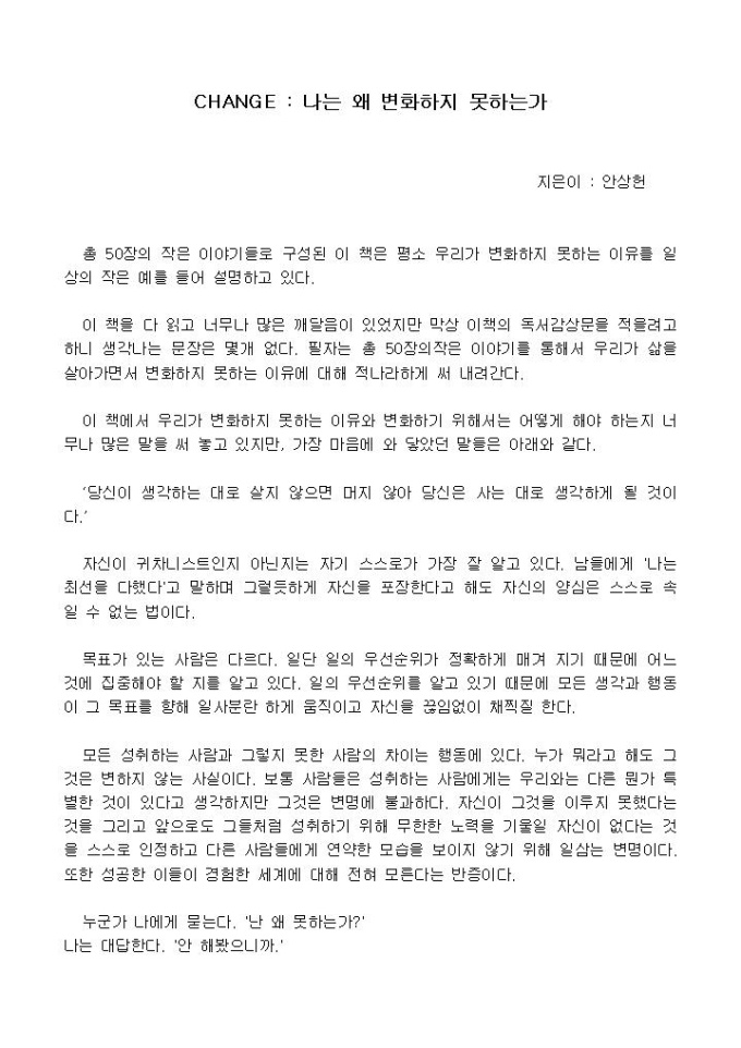 이 책을 다 읽고 너무나 많은 깨달음이 있었지만 막상 이책의 독서감상문을 적을려고 하니 생각나는 문장은 몇개 없다. 필자는 총 50장의작은 이야기를 통해서 우리가 삶을 살아가면서 변화하지 못하는 이유에 대해 적나라하게 써 내려간다.