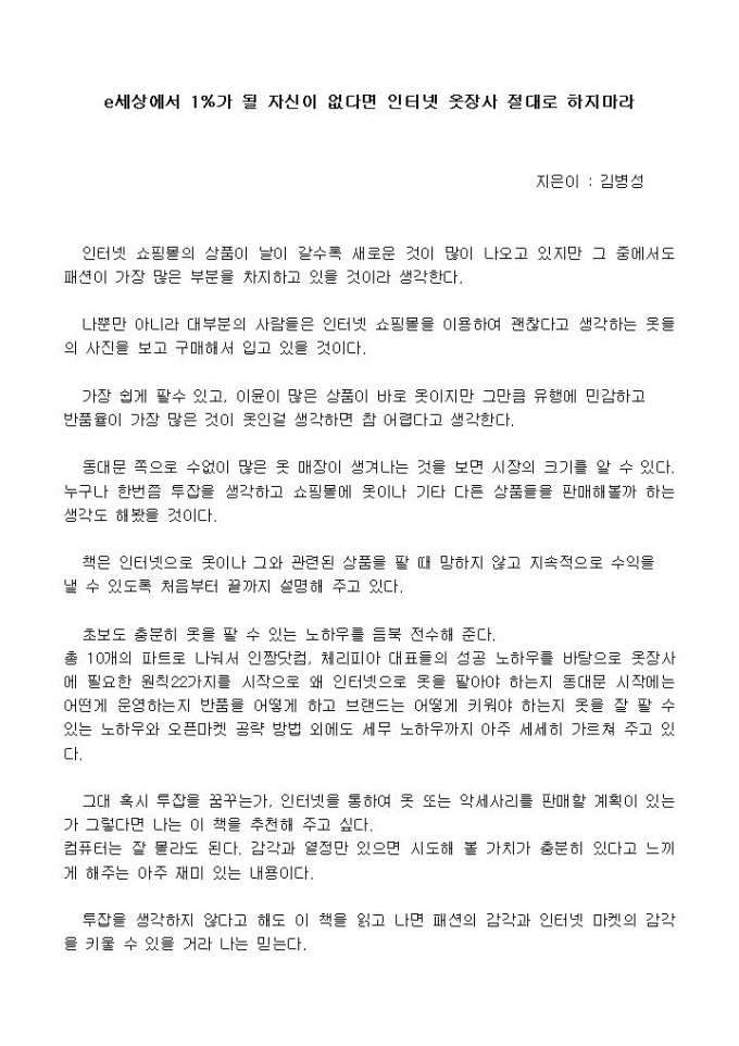 [독후감]e세상에서 1%가 될 자신이 없다면 인터넷 옷장사 절대로 하지마라_김병성 지음