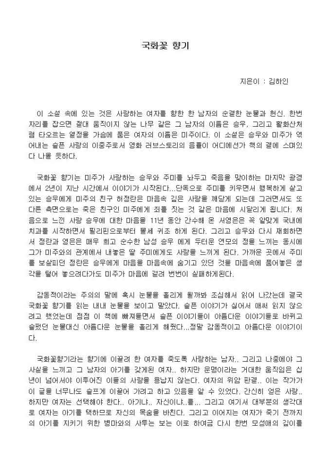 이 소설 속에 있는 것은 사랑하는 여자를 향한 한 남자의 순결한 눈물과 헌신. 한번 자리를 잡으면 절대 움직이지 않는 나무 같은 그 남자의 이름은 승우, 그리고 활화산처럼 타오르는 열정을 가슴에 품은 여자의 이름은 미주이다. 이 소설은 승우와 미주가 엮어내는 슬픈 사랑의 이중주로서 영화 러브스토리의 음률이 어디에선가 책의 결에 스며있다 나올 듯하다.