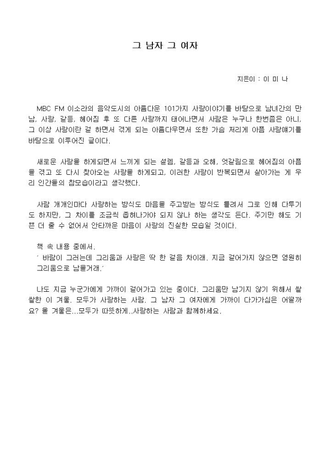MBC FM 이소라의 음악도시의 아름다운 101가지 사랑이야기를 바탕으로 남녀간의 만남, 사랑, 갈등, 헤어짐 후 또 다른 사랑까지 태어나면서 사람은 누구나 한번쯤은 아니, 그 이상 사랑이란 걸 하면서 겪게 되는 아름다우면서 또한 가슴 저리게 아픔 사랑얘기를 바탕으로 이루어진 글이다.