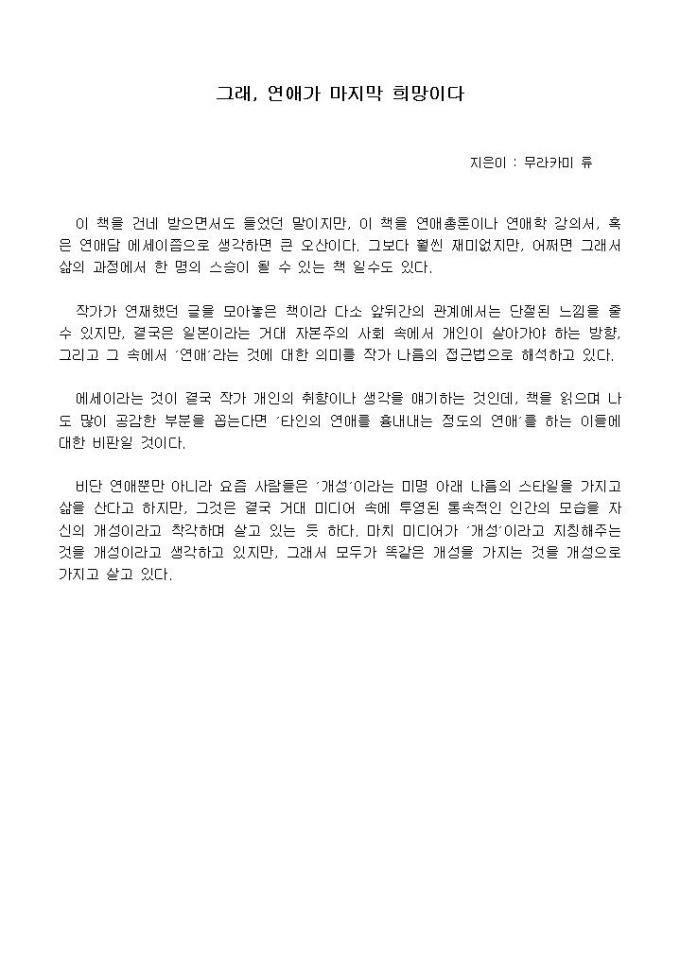 이 책을 건네 받으면서도 들었던 말이지만, 이 책을 연애총론이나 연애학 강의서, 혹은 연애담 에세이쯤으로 생각하면 큰 오산이다. 그보다 훨씬 ....
