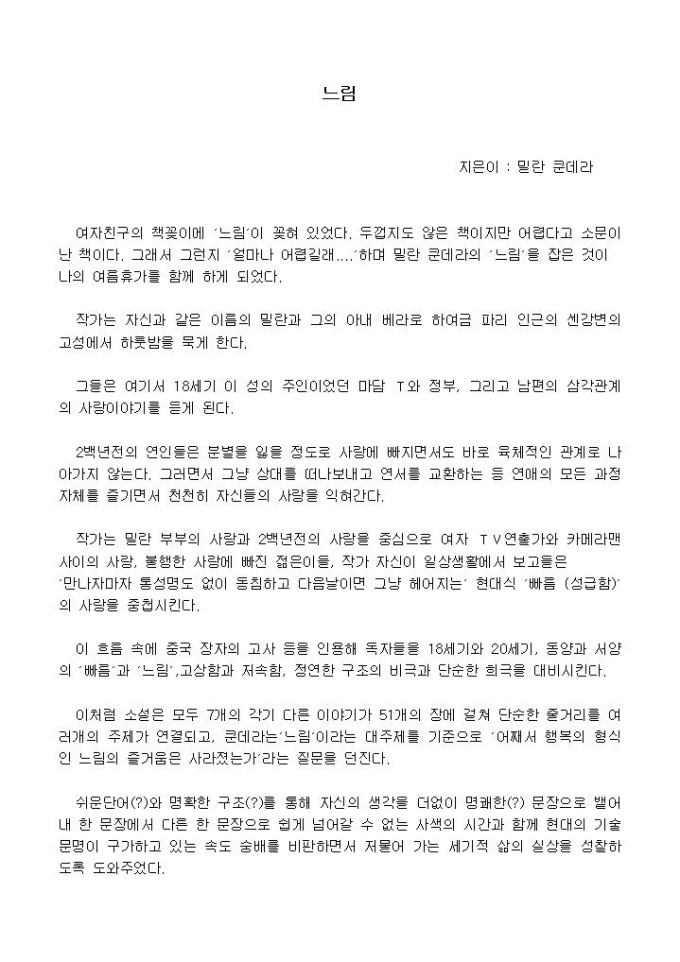 작가는 자신과 같은 이름의 밀란과 그의 아내 베라로 하여금 파리 인근의 센강변의 고성에서 하룻밤을 묵게 한다.