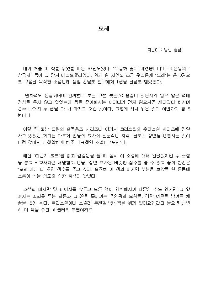 내가 처음 이 책을 읽었을 때는 97년도였다. ′무궁화 꽃이 피었습니다′나 이문열의 ′삼국지′ 등이 그 당시 베스트셀러였다. 읽게 된 사연도 조금 우스운게 ′모레′는 총 3권으로 구성된 묵직한 소설인데 생일 선물로 친구에게 1권을 선물로 받았었다.