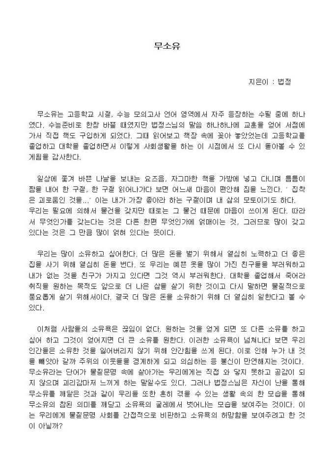 무소유는 고등학교 시절, 수능 모의고사 언어 영역에서 자주 등장하는 수필 중에 하나였다. 수능준비로 한창 바쁠 때였지만 법정스님의 말씀 하나하나에 교훈을 얻어 서점에 가서 직접 책도 구입하게 되었다.