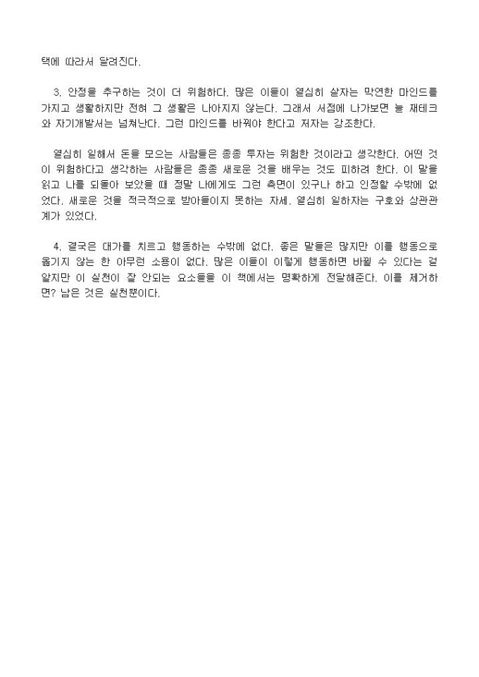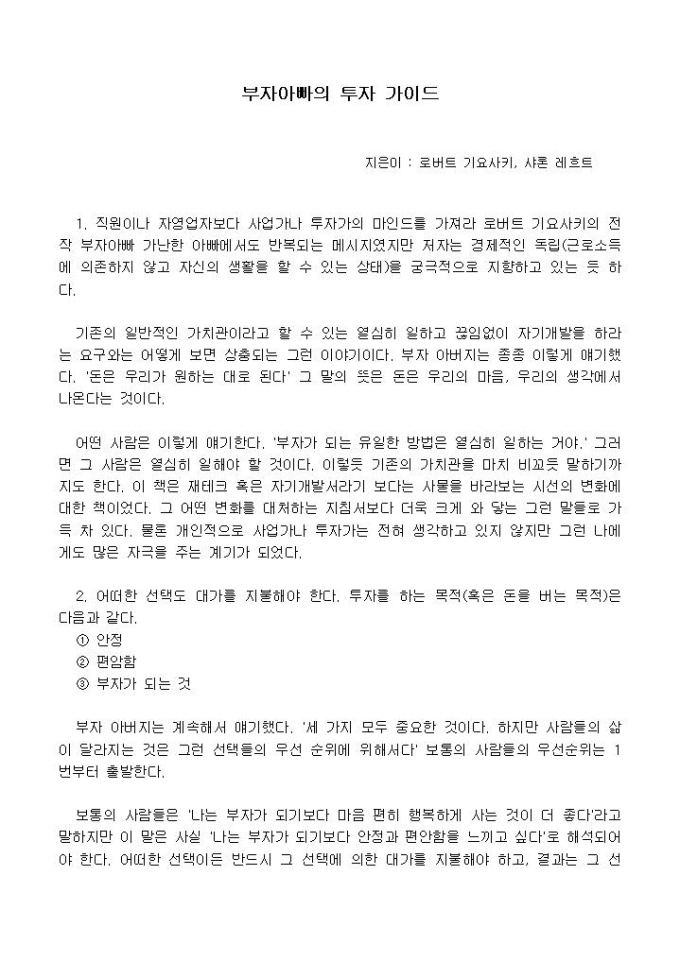 기존의 일반적인 가치관이라고 할 수 있는 열심히 일하고 끊임없이 자기개발을 하라는 요구와는 어떻게 보면 상충되는 그런 이야기이다. 부자 아버지는 종종 이렇게 얘기했다.
