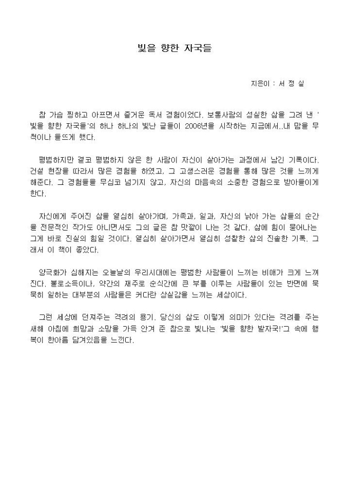참 가슴 찡하고 아프면서 즐거운 독서 경험이었다. 보통사람의 성실한 삶을 그려 낸 ´빛을 향한 자국들´의 하나 하나의 빛난 글들이 2006년을 시작하는 지금에서..내 맘을 무척이나 들뜨게 했다.