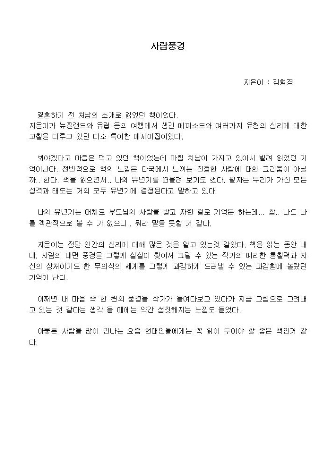 지은이는 정말 인간의 심리에 대해 많은 것을 알고 있는것 같았다. 책을 읽는 동안 내내, 사람의 내면 풍경을 그렇게 샅샅이 찾아서 그릴 수 있는 작가의 예리한 통찰력과 자신의 상처이기도 한 무의식의 세계를 그렇게 과감하게 드러낼 수 있는 과감함에 놀랐던 기억이 난다.