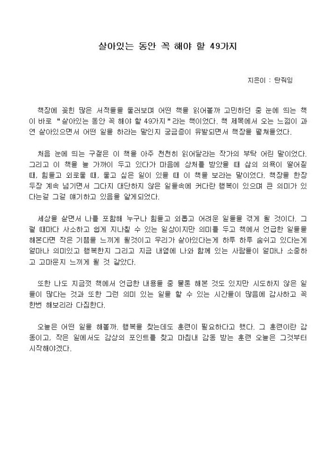 처음 눈에 띄는 구절은 이 책을 아주 천천히 읽어달라는 작가의 부탁 어린 말이었다. 그리고 이 책을 늘 가까이 두고 있다가 마음에 상처를 받았을 때 삶의 의욕이 떨어질 때, 힘들고 외로울 때, 울고 싶은 일이 있을 때 이 책을 보라는 말이었다.