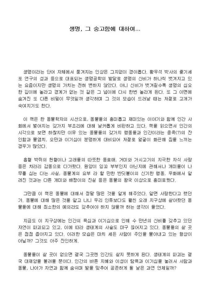 생명이라는 단어 자체에서 풍겨지는 인상은 그지없이 경이롭다. 황우석 박사의 줄기세포 연구의 성과 등으로 대표되는 생명공학의 발달로 생명의 신비가 하나씩 벗겨지고 있는 요즘이지만 생명의 가치는 전혀 변하지 않았다.