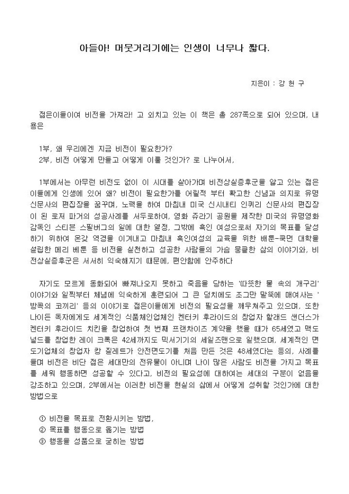 1부에서는 아무런 비전도 없이 이 시대를 살아가며 비전상실증후군을 앓고 있는 젊은이들에게 인생에 있어 왜? 비전이 필요한가를 어릴적 부터 확고한 신념과 의지로 유명 신문사의 편집장을 꿈꾸며...