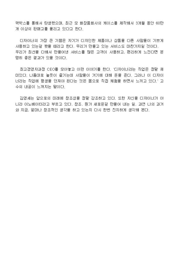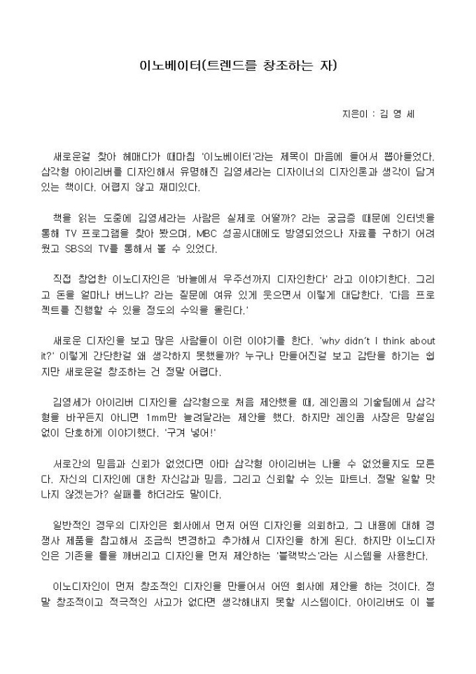 새로운걸 찾아 헤매다가 때마침 ´이노베이터´라는 제목이 마음에 들어서 뽑아들었다. 삼각형 아이리버를 디자인해서 유명해진 김영세라는 디자이너의 디자인론과 생각이 담겨 있는 책이다. 어렵지 않고 재미있다.