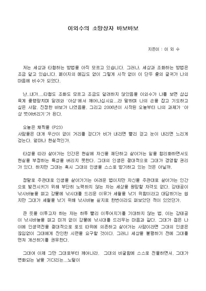 저는 세상과 타협하는 방법을 아직 모르고 있습니다. 그러나, 세상과 조화하는 방법은 조금 알고 있습니다. 페이지의 메김도 없이 그렇게 시작 없이 이 단두 줄의 글귀가 나의 마음에 비수가 되었다.