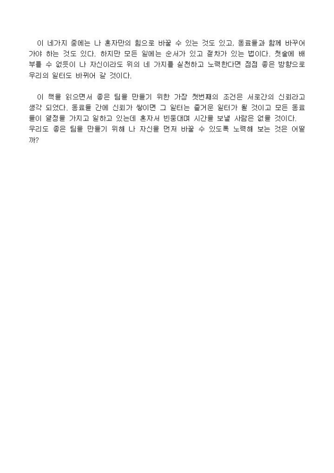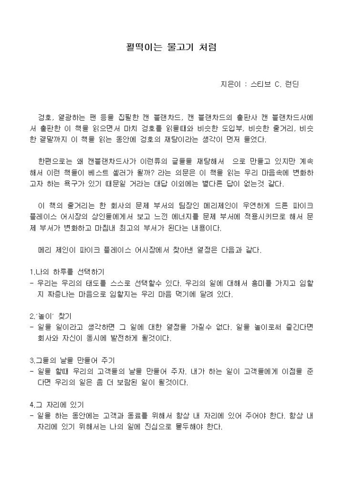 겅호, 열광하는 팬 등을 집필한 캔 블랜차드, 캔 블랜차드의 출판사 캔 블랜차드사에서 출판한 이 책을 읽으면서 마치 겅호를 읽을때와 비슷한 도입부, 비슷한 줄거리, 비슷한 결말까지 이 책을 읽는 동안에 겅호의 재탕이라는 생각이 먼저 들었다.