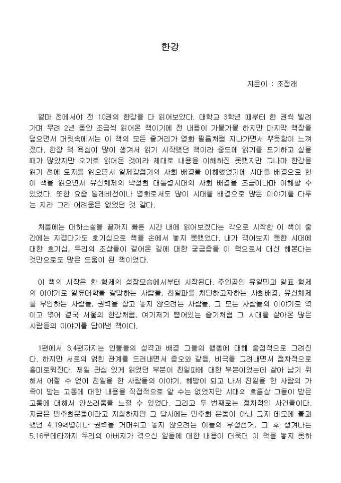얼마 전에서야 전 10권의 한강을 다 읽어보았다. 대학교 3학년 때부터 한 권씩 빌려가며 무려 2년 동안 조금씩 읽어온 책이기에 전 내용이 가물가물 하지만 마지막 책장을 덮으면서 머릿속에서는 이 책의 모든 줄거리가 영화 필름처럼 지나가면서 뿌듯함이 느껴졌다.