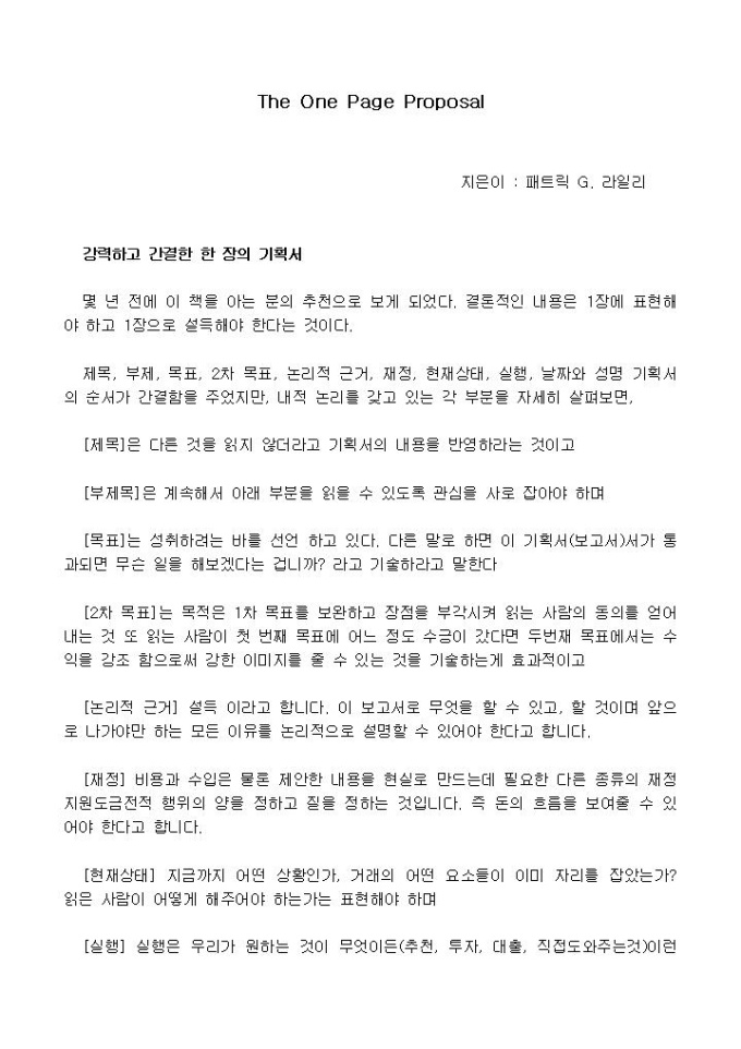9,000원/월[본문 미리보기] 몇 년 전에 이 책을 아는 분의 추천으로 보게 되었다. 결론적인 내용은 1장에 표현해야 하고 1장으로 설득해야 한다는 것이다. 제목, 부제, 목표, 2차 목표, 논리적 근거, 재정, 현재상태, 실행, 날짜와 성명 기획서의 순서가 간결함을 주었지만, 내적 논리를 갖고 있는 각 부분을 자세히 살펴보면,