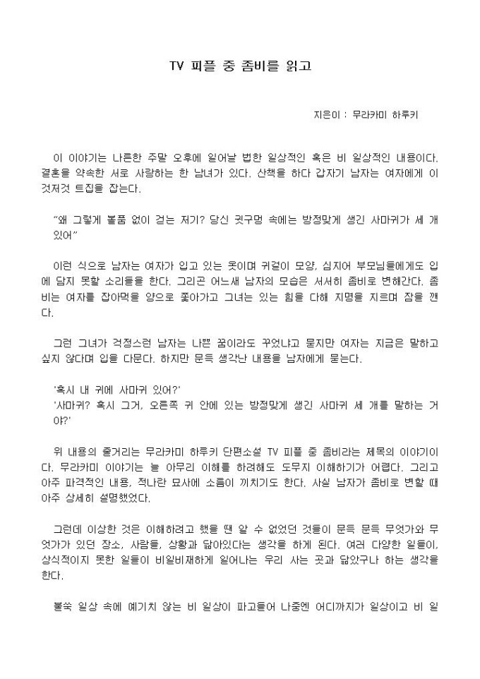 이 이야기는 나른한 주말 오후에 일어날 법한 일상적인 혹은 비 일상적인 내용이다. 결혼을 약속한 서로 사랑하는 한 남녀가 있다. 산책을 하다 갑자기 남자는 여자에게 이것저것 트집을 잡는다.