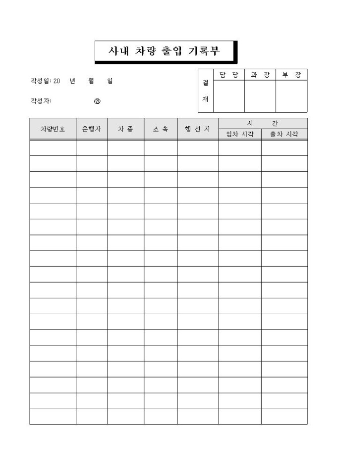 9,000원/월차량번호, 운행자, 차종, 소속, 행선지, 시간의 항목으로 구성된 사내 차량 출입 기록부 양식입니다.