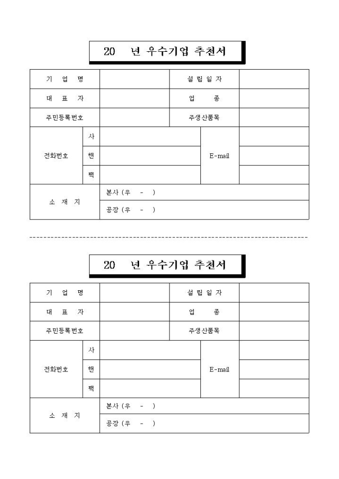 9,000원/월기업명, 설립일자, 대표자, 업종, 주민등록번호, 주생산품목, 전화번호, E-mail, 소재지의 항목으로 구성된 우수기업 추천서 양식입니다.