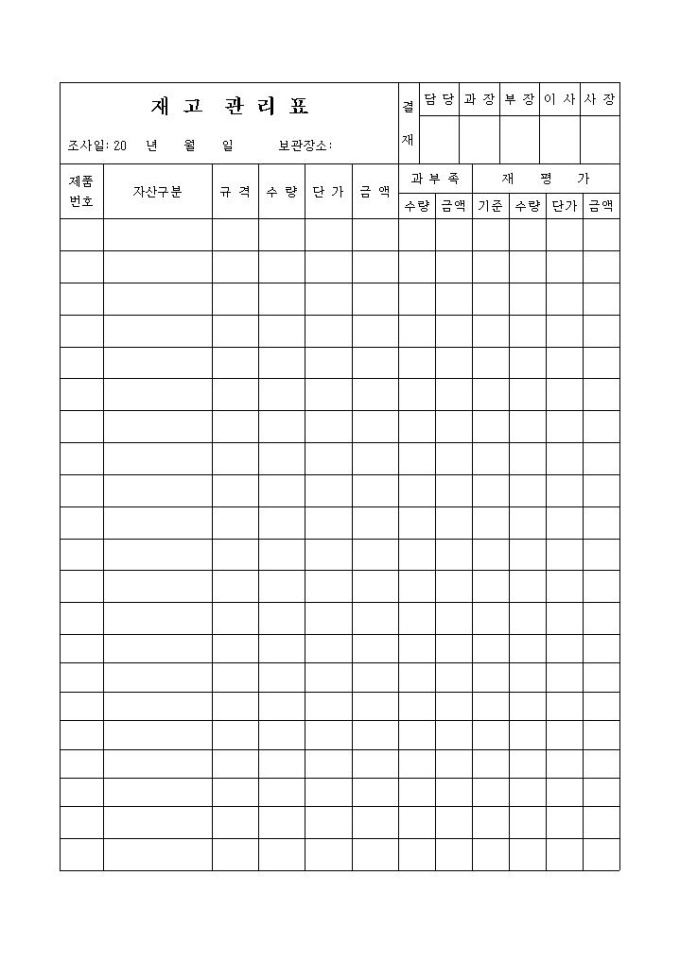 9,000원/월제품번호, 자산구분, 규격, 수량, 단가, 금액, 과부족, 재평가의 항목으로 구성된 재고 관리표 양식입니다.