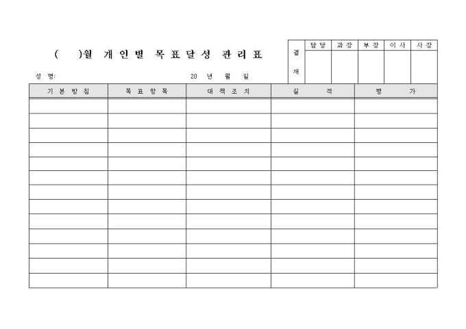 기본방침, 목표항목, 대책조치, 실적, 평가의 항목으로 구성된 개인별 목표달성 관리표 양식입니다.