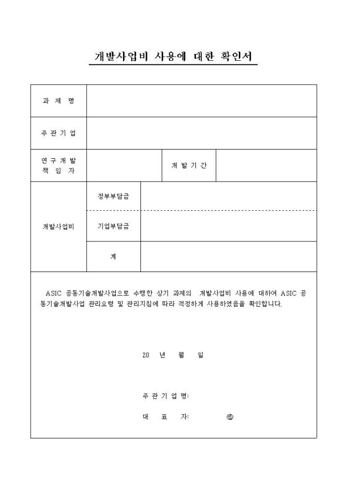 과제명, 주관기업, 연구개발 책임자, 개발기간, 개발사업비, 등의 항목으로 구성된 개발사업비 사용에 대한 확인서 양식입니다.