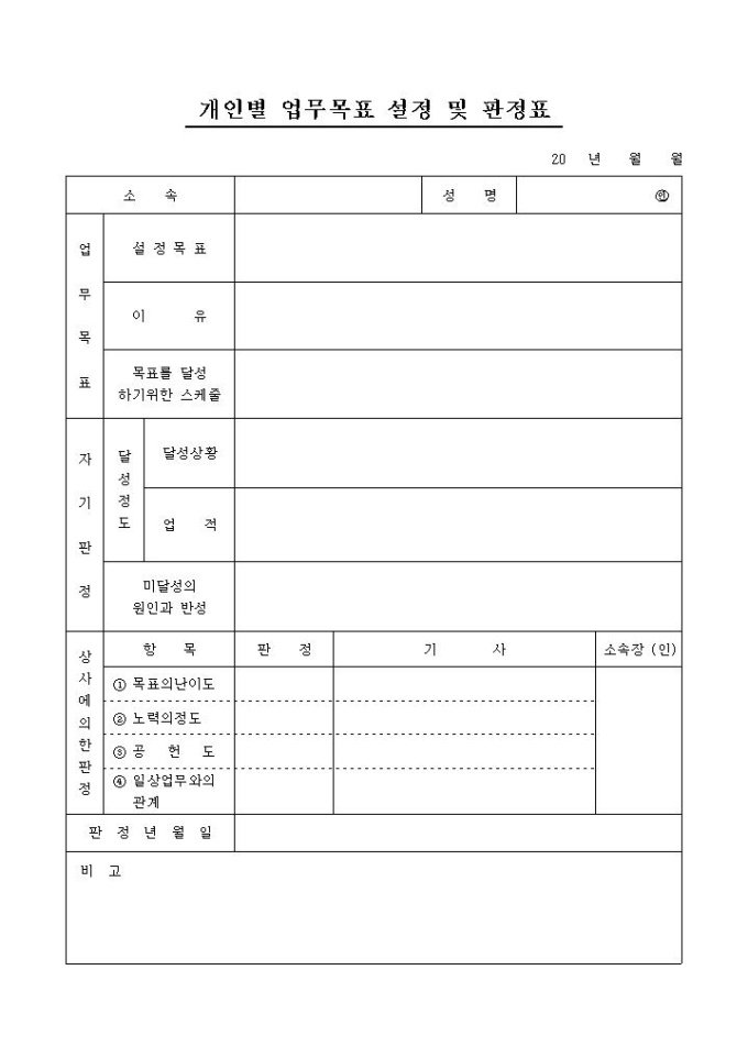 9,000원/월업무목표, 자기판정, 상사에의한판정, 비고 등의 항목으로 구성된 개인별 업무목표 설정 및 판정표 양식입니다.