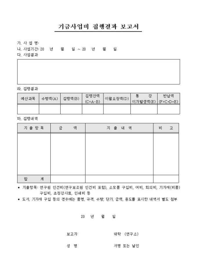 사업명, 사업기간, 사업결과, 집행결과, 집행내역의 항목으로 구성된 기급사업비 집행결과 보고서 양식입니다.