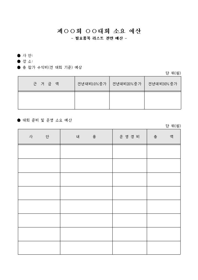 9,000원/월사안, 장소, 총 참가 수익비 예상, 대회준비 및 운영소요 예산의 항목으로 구성된 개회식및경기관련소요예산표 양식입니다.