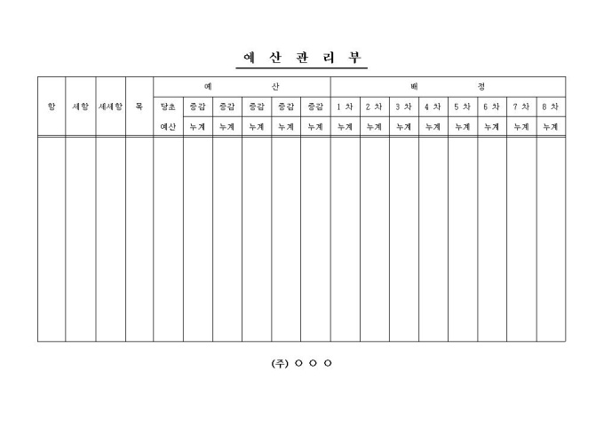 항, 세항, 세세항, 목, 예산, 배정 등의 항목으로 구성된 예산관리부 양식입니다.