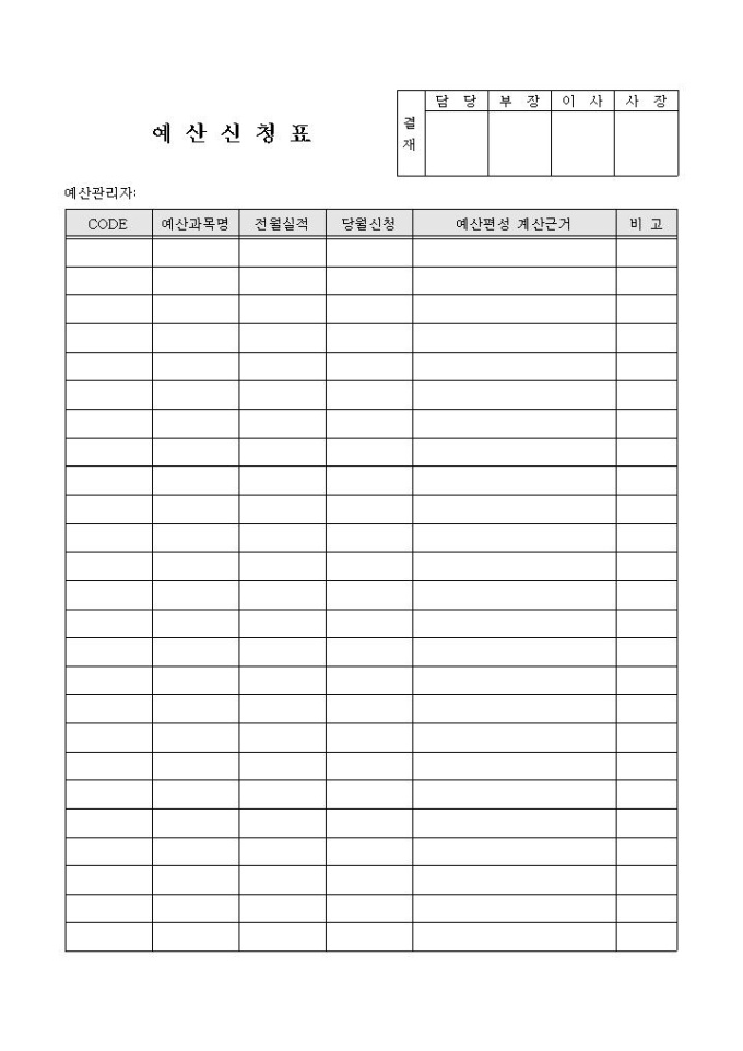 CODE, 예산과목명, 전월실적, 당월신청, 예산편성 계산근거, 비고의 항목으로 구성된 예산신청표 양식입니다.