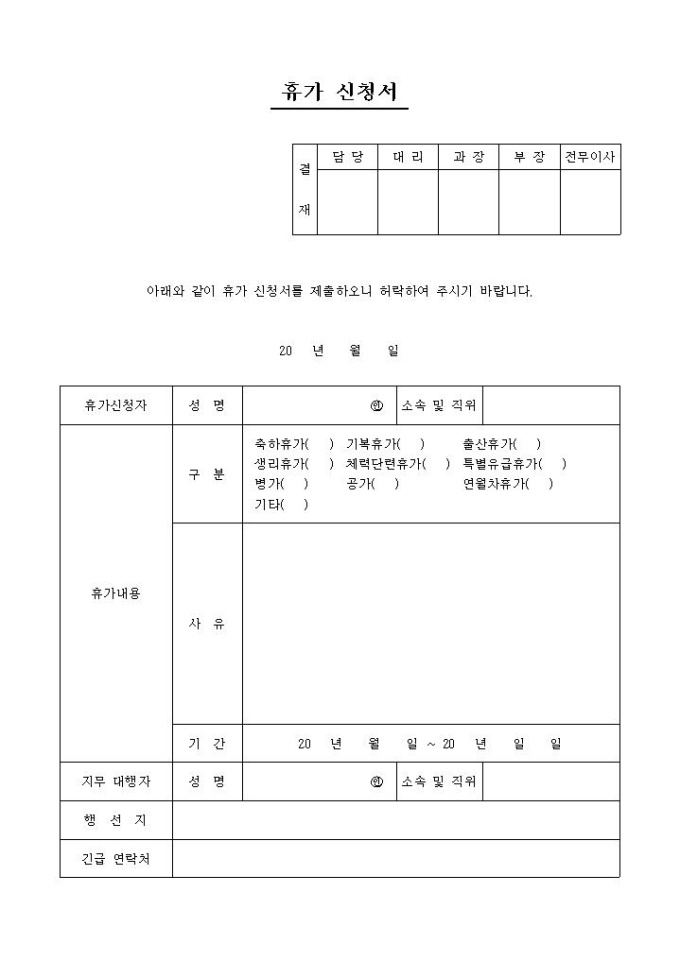9,000원/월휴가신청자, 휴가내용, 직무 대행자, 행선지, 긴급 연락처의 항목으로 구성된 휴가 신청서 양식입니다.