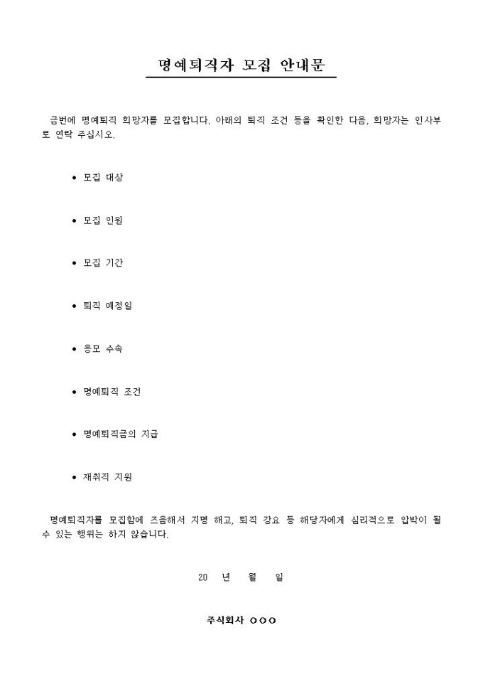 9,000원/월명예퇴직 희망자를 모집할 때 사용하는 명예퇴직자 모집 안내문 양식입니다. 모집대상, 모집인원, 모집기간, 퇴직 예정일, 응모수속, 명예퇴직 조건, 명예퇴직금의 지급, 재취직 지원의 항목으로 구성되어 있습니다.
