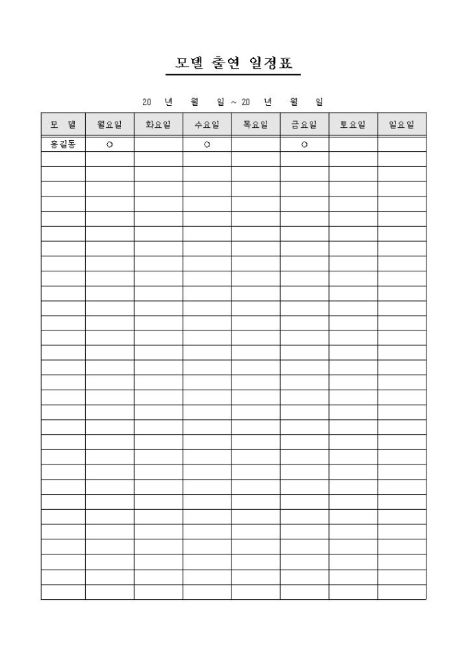 9,000원/월모델 출연에 대한 일정을 요일별로 기록/관리할 수 있는 모델 출연 일정표 양식입니다.