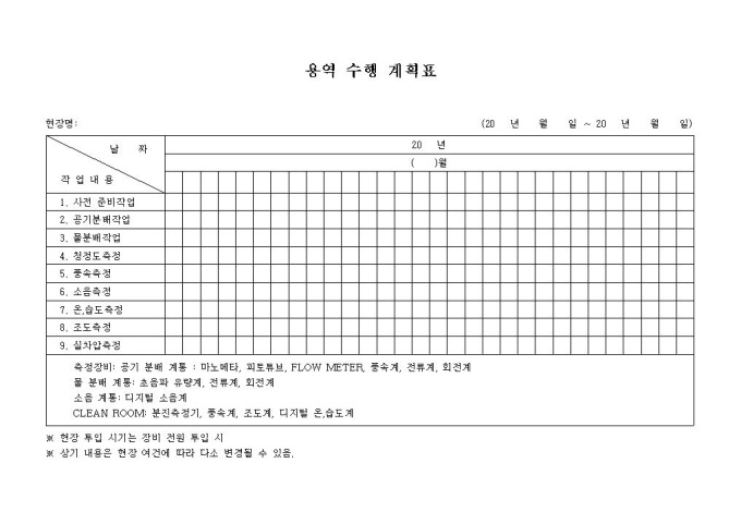 날짜별로 작업내용을 기록할 때 사용하는 용역 수행 계획표 양식입니다.