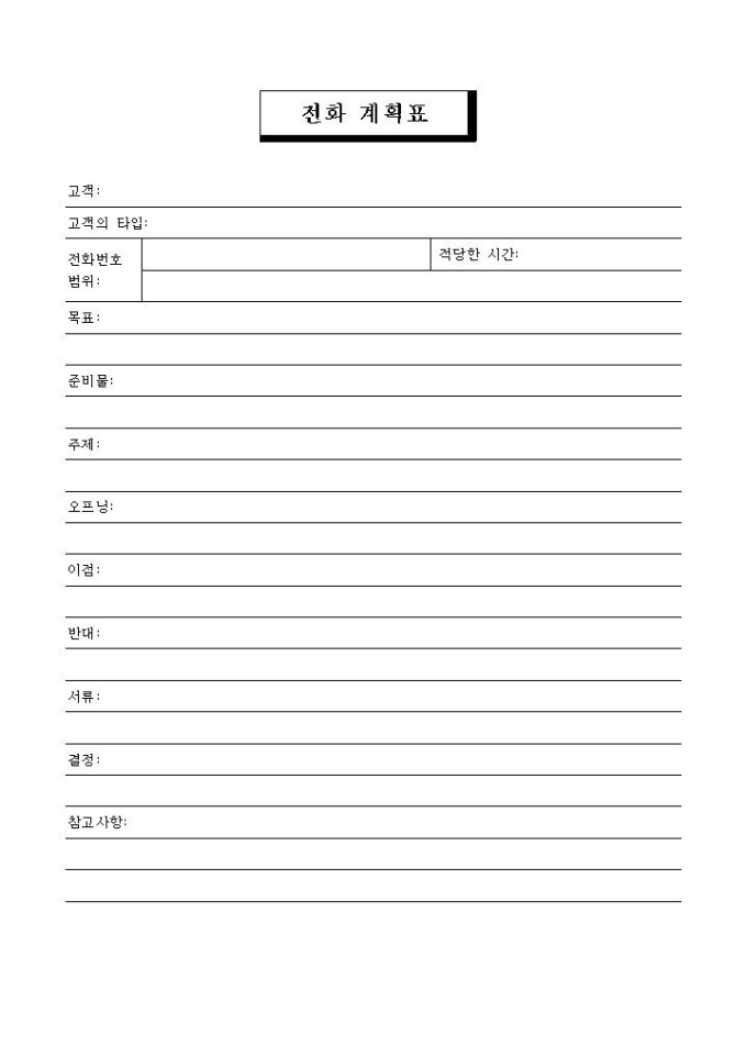 9,000원/월고객과의 통화 전 관련 내용을 준비/기록할 수 있는 전화 계획표 양식입니다.