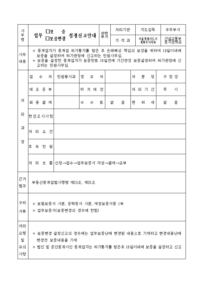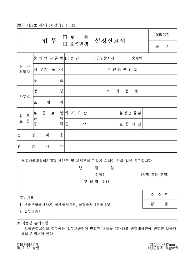 9,000원/월별지 제17호 서식으로 부동산중개업법시행령 제23조 및 제25조의 규정에 의한 업무(보증,보증변경)설정신고서입니다.