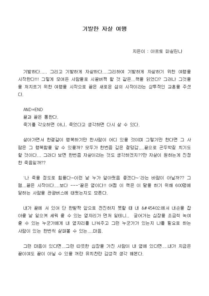 기발하다..... 그리고 기발하게 자살하다....그리하여 기발하게 자살하기 위한 여행을 시작한다!!! 그렇게 모여든 사람들로 시끌버쩍 할 것 같은...책을 읽었다? 그러나 그것들을 저지르기 위한 여행을 시작으로 끝은 새로운 삶의 시작이라는 상투적인 교훈을 주셨 다.