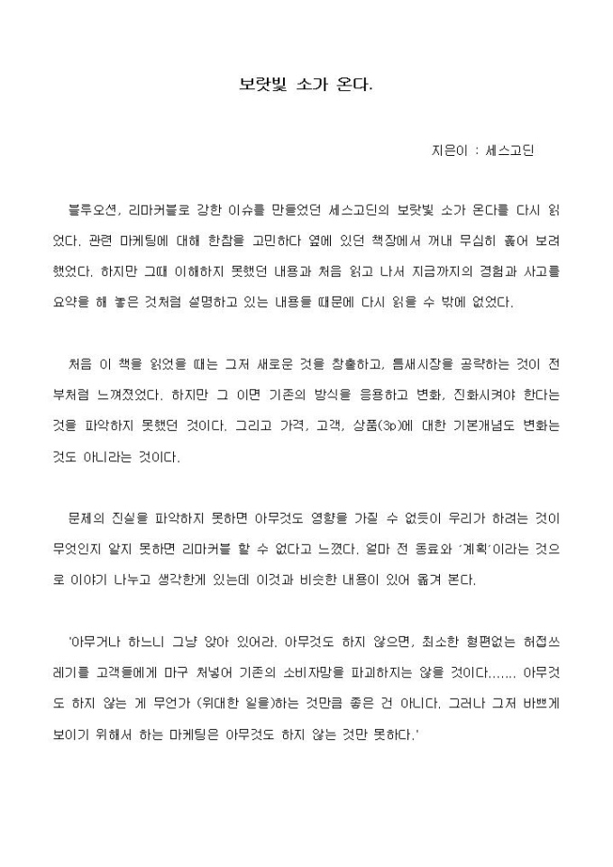 블루오션, 리마커블로 강한 이슈를 만들었던 세스고딘의 보랏빛 소가 온다를 다시 읽었다. 관련 마케팅에 대해 한참을 고민하다 옆에 있던 책장에서 꺼내 무심히 훑어 보려했었다. 하지만 그때 이해하지 못했던 내용과 처음 읽고 나서 지금까지의 경험과 사고를 요약을 해 놓은 것처럼 설명하고 있는 내용들 때문에 다시 읽을 수 밖에 없었다.