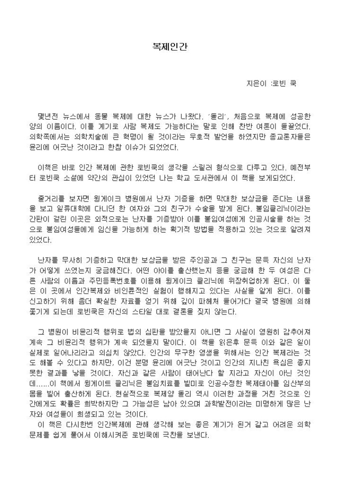 몇년전 뉴스에서 동물 복제에 대한 뉴스가 나왔다. ′돌리′, 처음으로 복제에 성공한 양의 이름이다. 이를 계기로 사람 복제도 가능하다는 말로 인해 찬반 여론이 들끌었다. 의학쪽에서는 의학치술에 큰 혁명이 될 것이라는 우호적 발언을 하였지만 종교론자들은 윤리에 어긋난 것이라고 한참 이슈가 되었었다.
