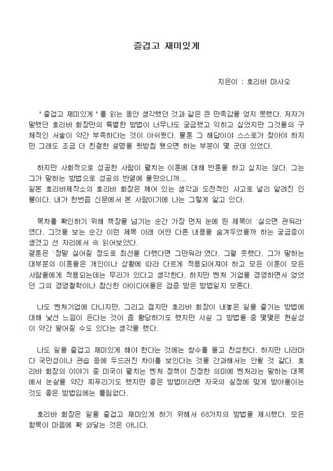 ‘즐겁고 재미있게’를 읽는 동안 생각했던 것과 같은 큰 만족감을 얻지 못했다. 저자가 말했던 호리바 회장만의 특별한 방법이 너무나도 궁금했고 익히고 싶었지만 그것들의 구체적인 서술이 약간 부족하다는 것이 아쉬웠다. 물론 그 해답이야 스스로가 찾아야 하지만 그래도 조금 더 친절한 설명을 뒷받침 됐으면 하는 부분이 몇 군데 있었다.