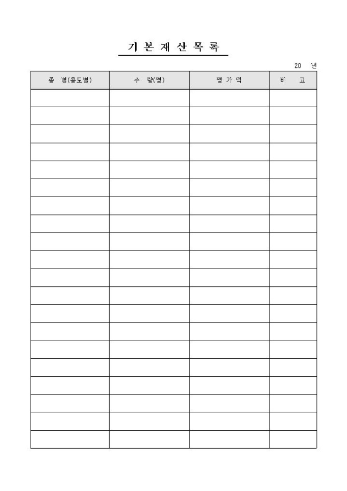 9,000원/월종별, 수량, 평가액, 비고의 항목으로 구성된 기본재산목록표 양식입니다.
