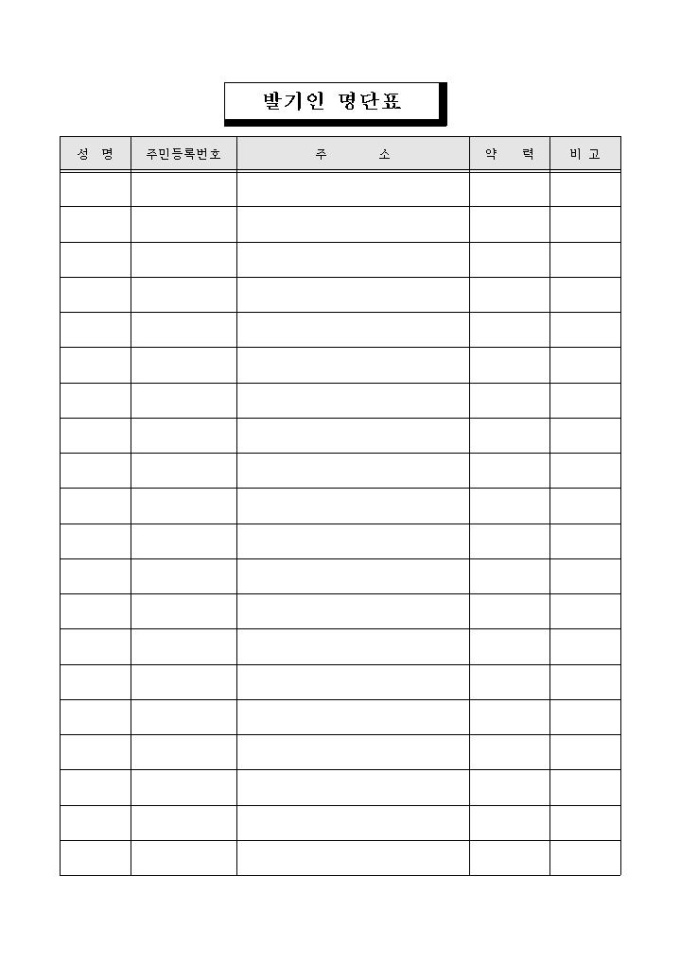 성명, 주민등록번호, 주소, 약력, 비고의 항목으로 구성된 발기인 명단표 양식입니다.