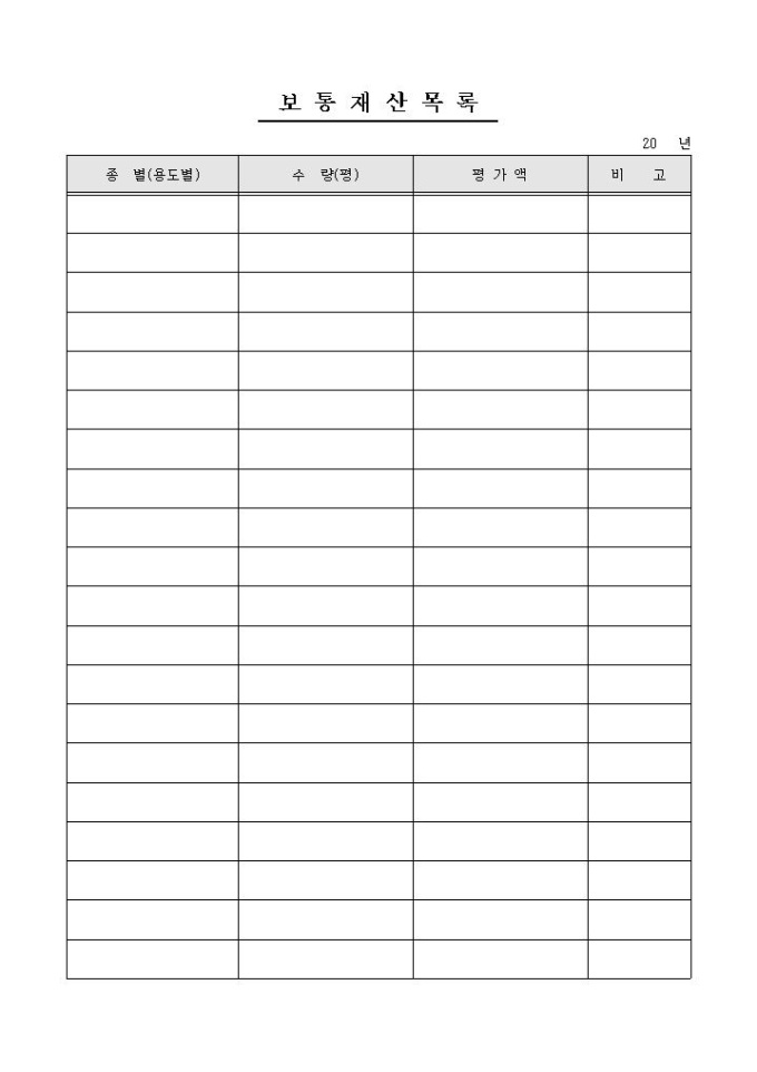 9,000원/월종별, 수량, 평가액, 비고의 항목으로 구성된 보통재산목록표 양식입니다.
